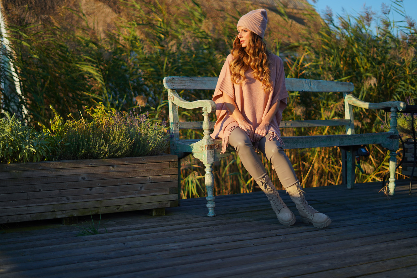 Was für eine Augenweide: Ein Poncho mit Fransen UND Schalkragen. Man muss ihn einfach lieben. Perfektes Match: eine enge Hose in taupe und Boots.