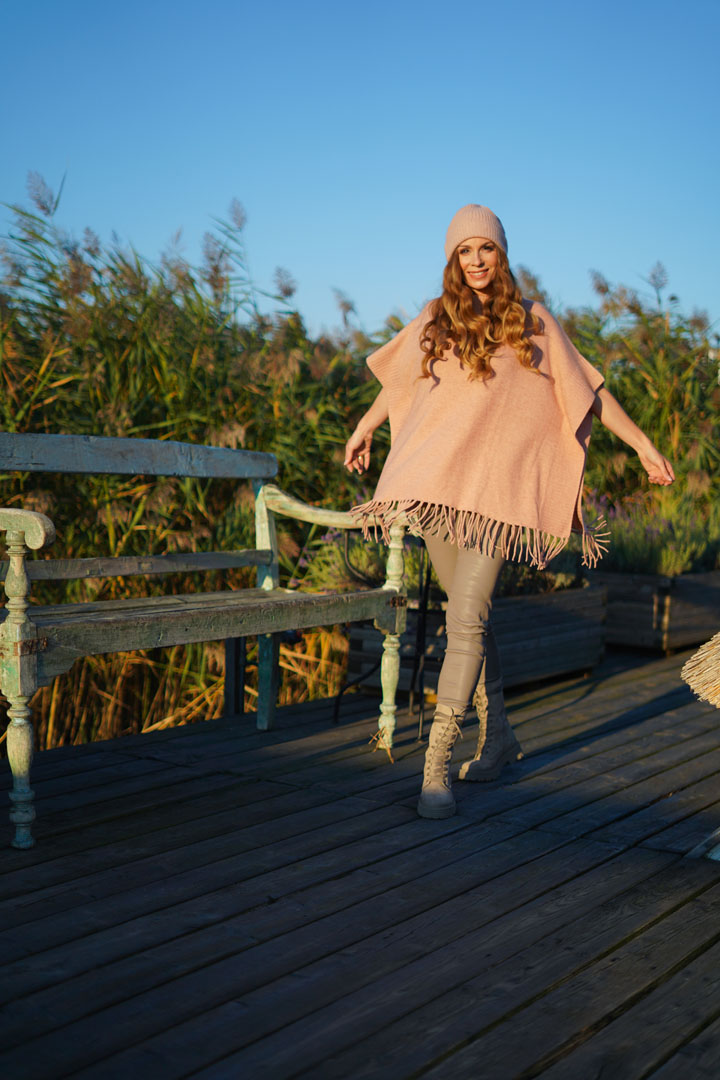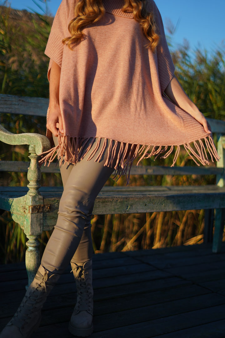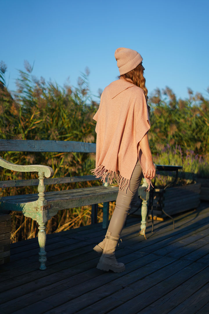 Was für eine Augenweide: Ein Poncho mit Fransen UND Schalkragen. Man muss ihn einfach lieben. Perfektes Match: eine enge Hose in taupe und Boots.