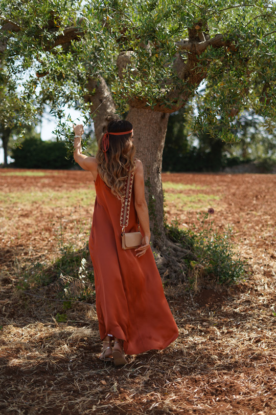 In diesem Kleid fühlst du dich wie die Göttin Aphrodite auf Besuch in den 1970er Jahren. Statt psychedelischer Muster punktet das Maxikleid mit terracottafarbener Eleganz.