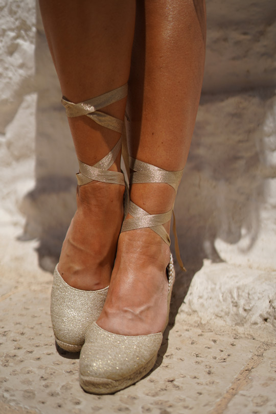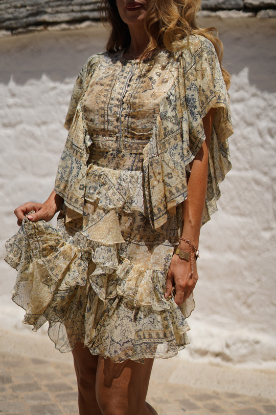 Mehrstufige Volants, mehr Muster, mehrere Knöpfe. Ein Minikleid, das mit all seinen Features massiv Eindruck macht. Zum Dahinschweben: die goldenen Espadrilles.