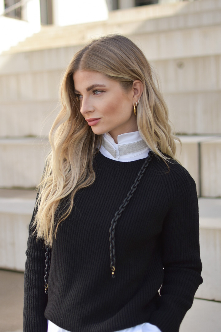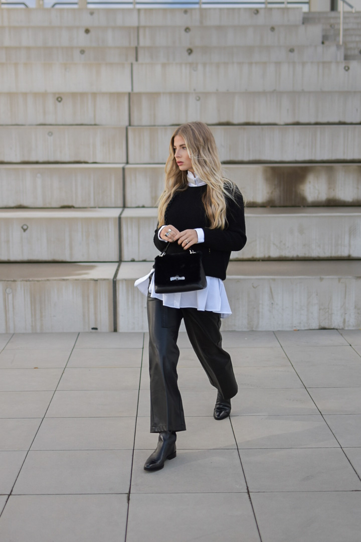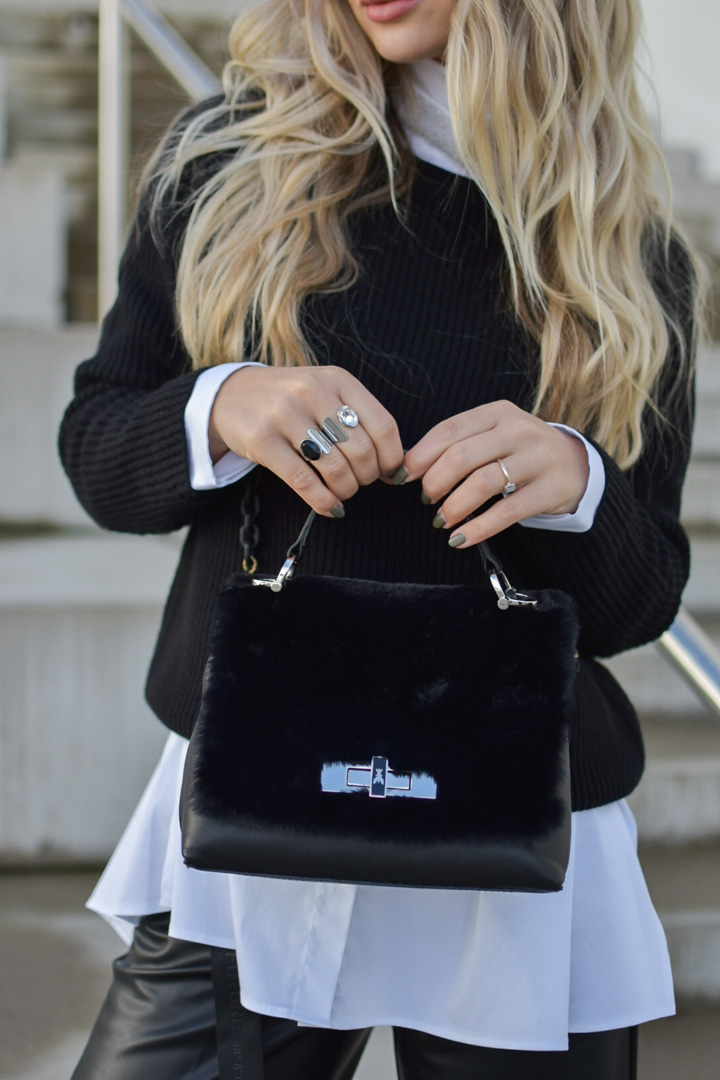 Hier treffen 3 Statement-Materialien zu einer starken Melange aufeinander: Fake-Fur (siehe Mini-Bag), veganes Leder und Baumwolle. Ein Ausrufezeichen setzt der Hemdkragen.