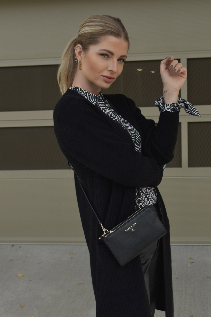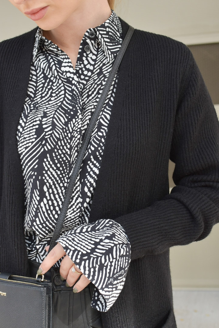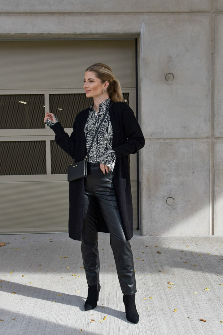 Klassisch und doch raffiniert: gemusterte Bluse mit verspielten Ärmeln, eine lange Strickweste und eine geniale Hose aus veganem Leder.