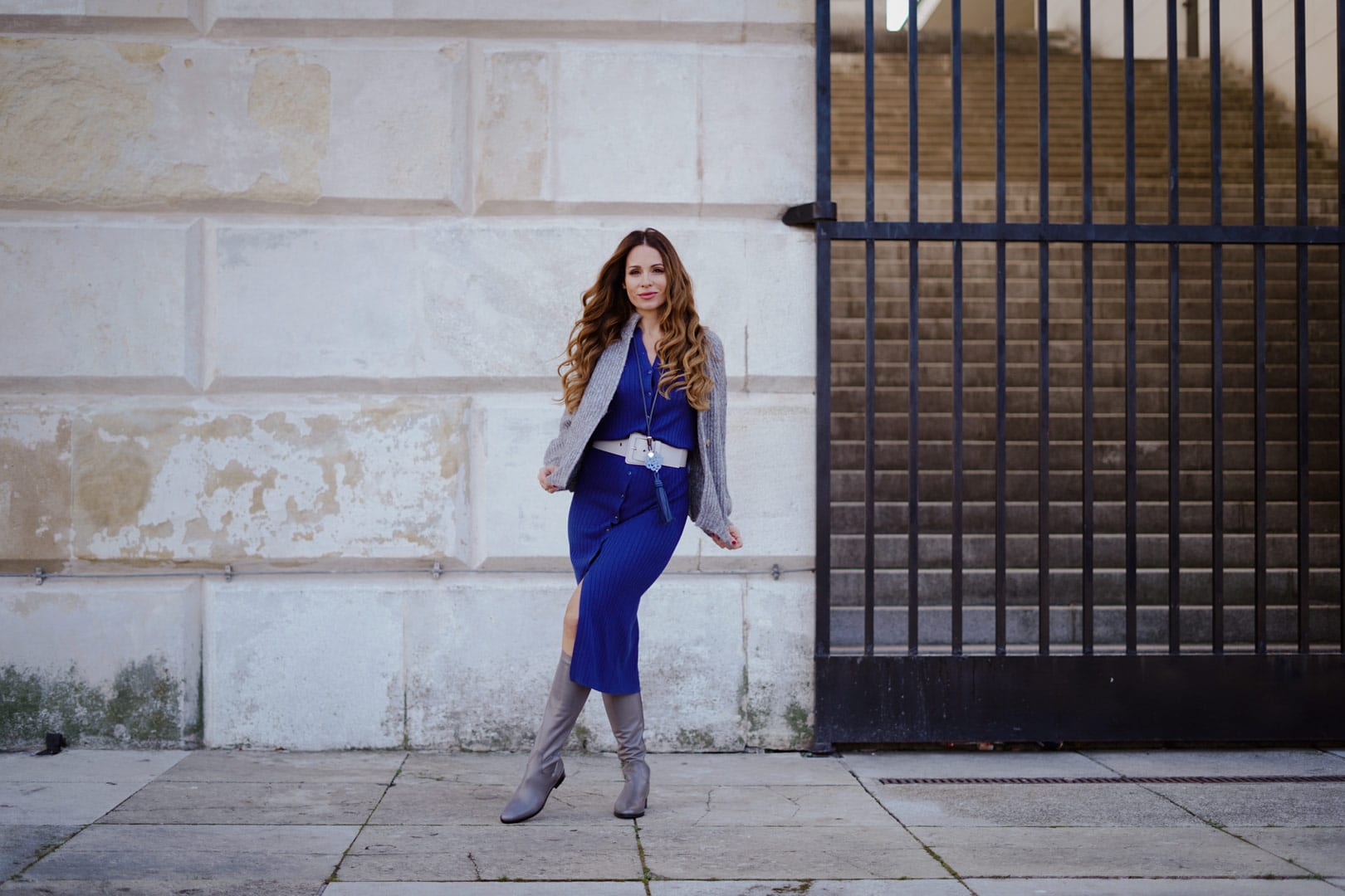 … gehört dieses Rippstrick-Kleid. Wie sehr – obliegt der Trägerin. Genial dazu: Eine kuschelige Grobstick-Weste mit Ballonarm, Glattlederstiefel und das eine oder andere Accessoire …