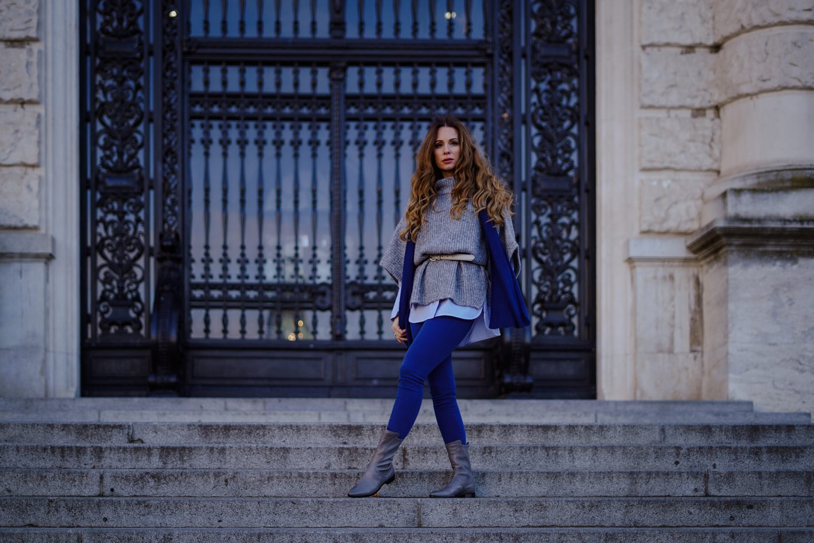 Egal, wie die Coronalage ist, diese Lagen liegen richtig – styletechnisch. Enge Color Jeans, weite Manschetten-Bluse und darüber ein oversized Poncho Pulli mit Alpaka Wolle. Positiv!