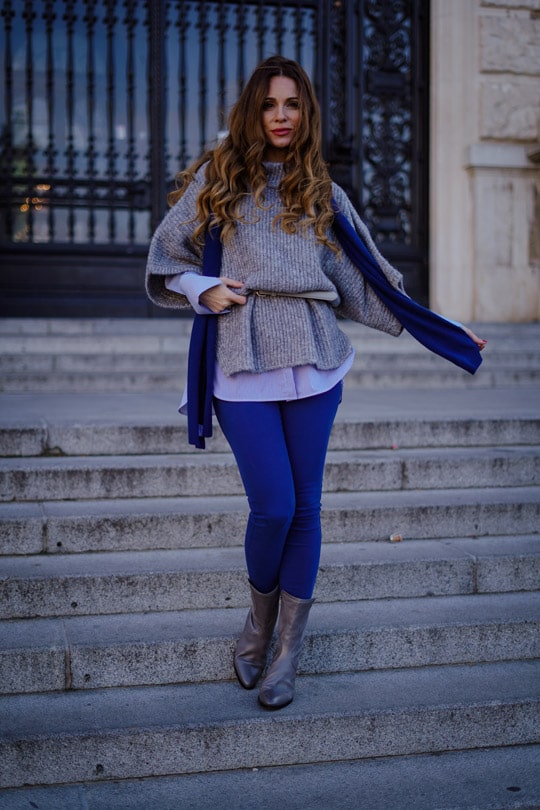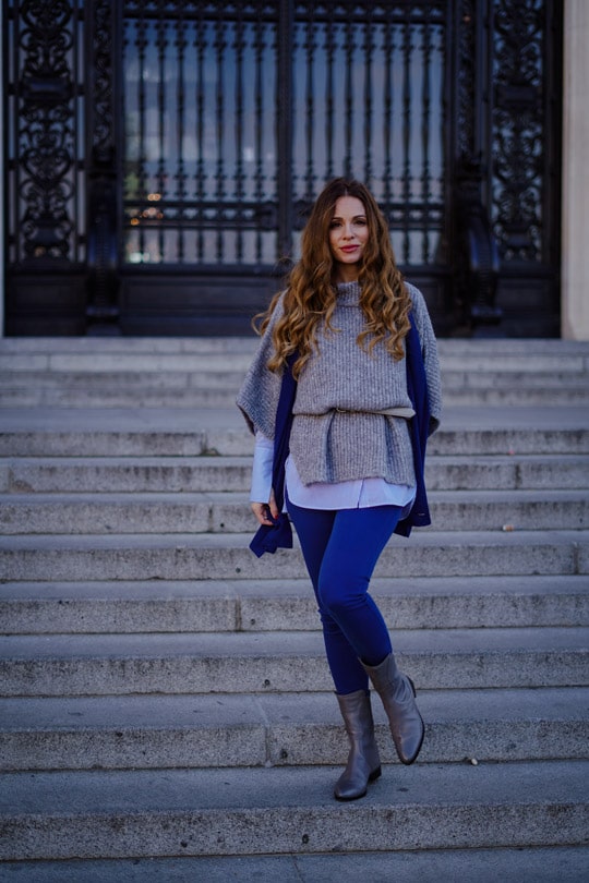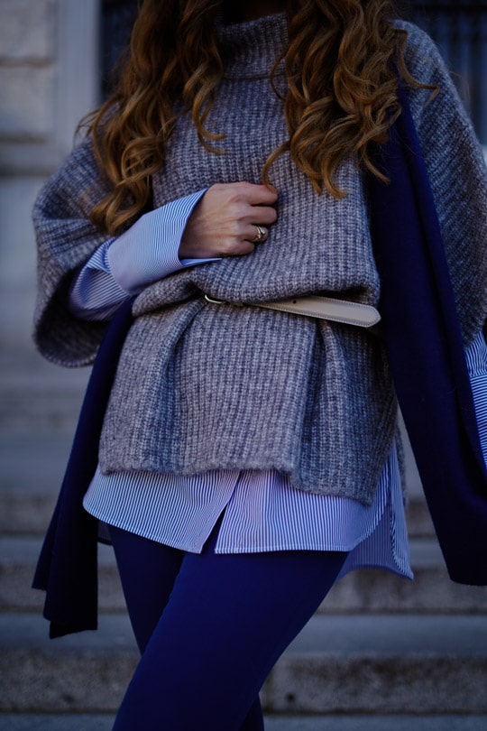 Egal, wie die Coronalage ist, diese Lagen liegen richtig – styletechnisch. Enge Color Jeans, weite Manschetten-Bluse und darüber ein oversized Poncho Pulli mit Alpaka Wolle. Positiv!
