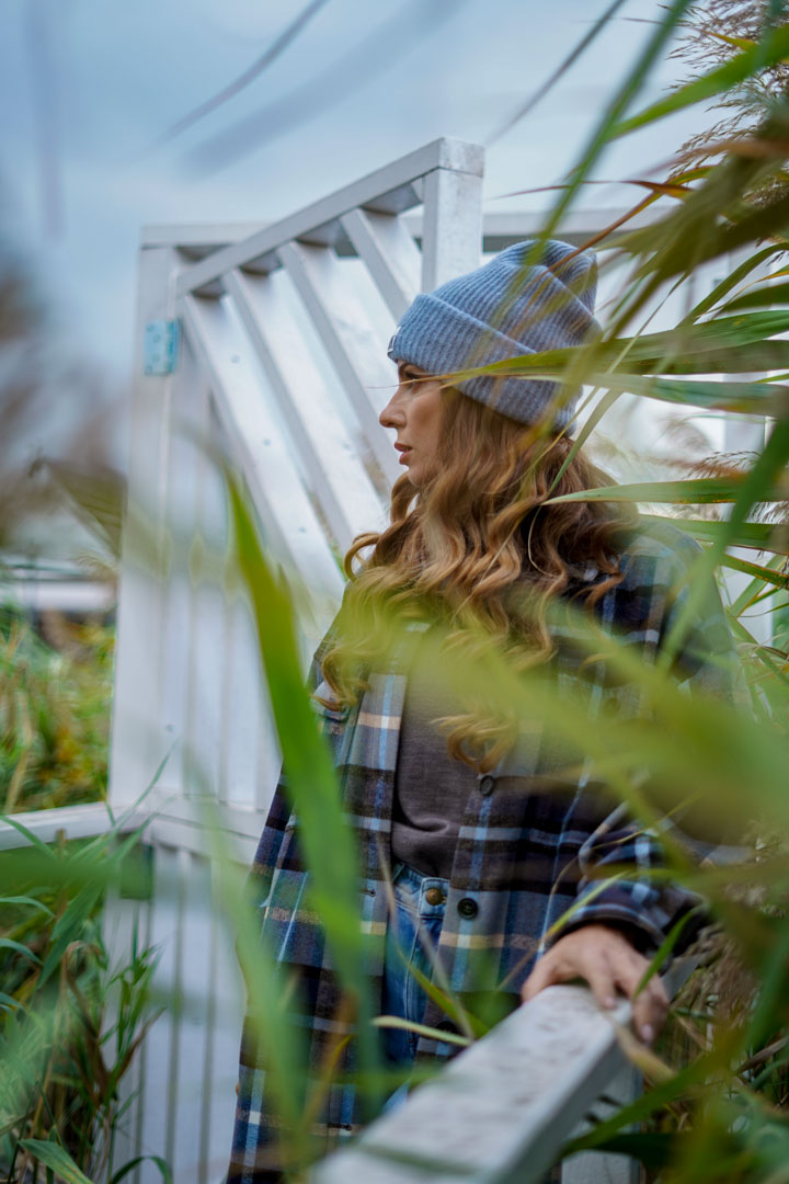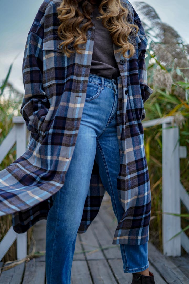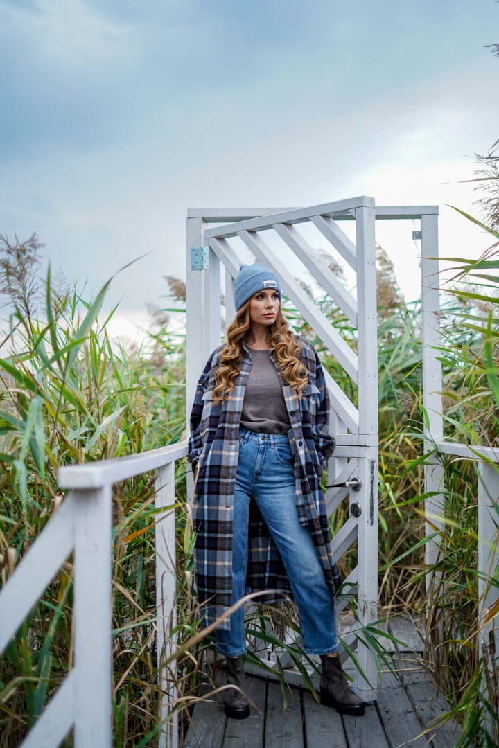 Leinen los und rein ins longline-Shacket! Blaues Karo zu Denim ist einfach ein Dream-Team. Richtig komplett wird der jugendliche Look mit der Stickmütze und den Chelsea Boots.