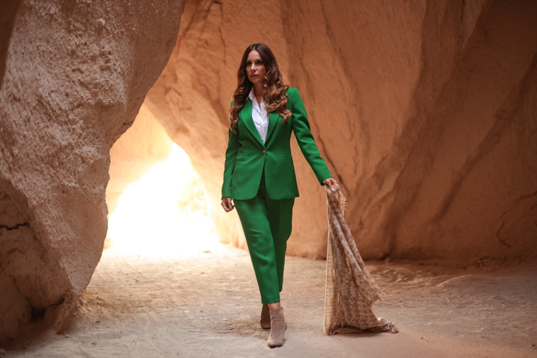 Grün ist die Farbe der Hoffnung. Mit dieser Business-Kombi bestehend aus einem Oversized Blazer und einer stretchy Anzughose in Jolly Green versprühen wir eine Extraportion Optimismus. Die Kompliment-Kurve wird steil nach oben gehen.