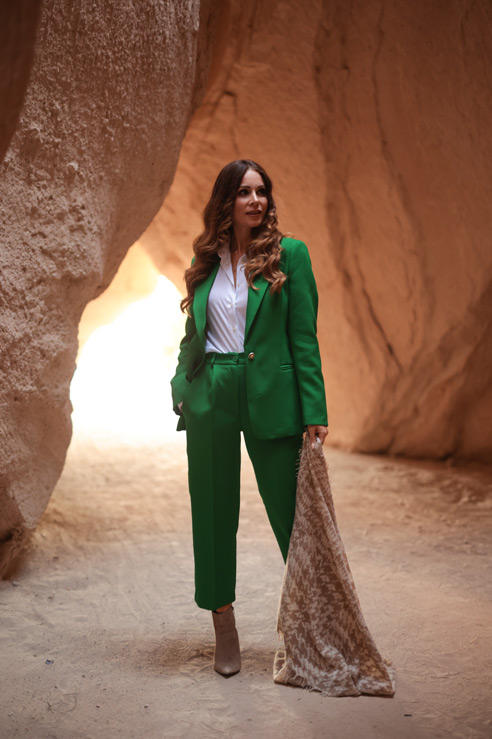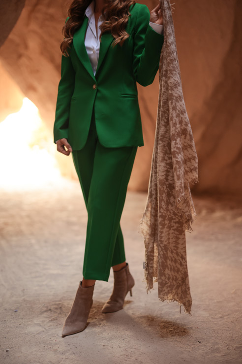 Grün ist die Farbe der Hoffnung. Mit dieser Business-Kombi bestehend aus einem Oversized Blazer und einer stretchy Anzughose in Jolly Green versprühen wir eine Extraportion Optimismus. Die Kompliment-Kurve wird steil nach oben gehen.