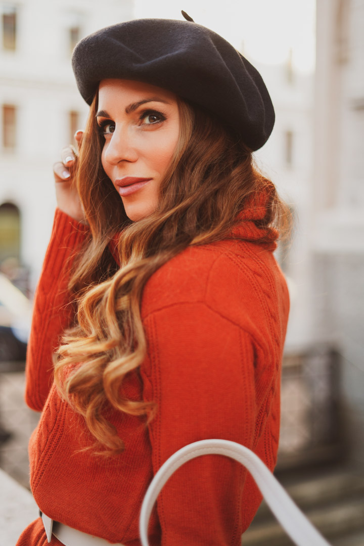Ein Strickkleid mit Zopfmuster klingt per se sehr brav – muss es aber nicht sein. Dafür sorgen die Overknee-Raulederstiefel und der die Taille betonende, breite Gürtel. Oh, là, là!