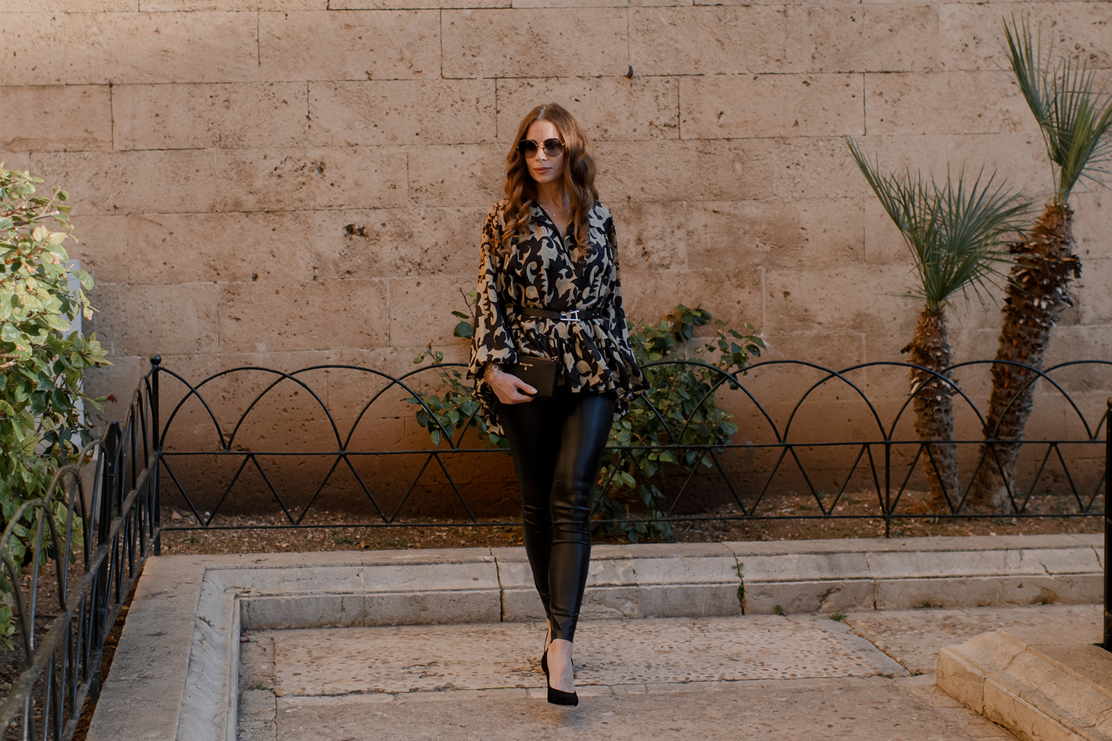 Entdecken Sie den Look, der Stil und Komfort vereint: die schwarze Lederleggings in Kombination mit einer lockeren Volantbluse. Diese vielseitige Kombination kann ohne oder mit Taillengürtel getragen werden, um Ihre Silhouette zu betonen. Klassische schwarze Pumps und eine kleine schwarze Clutch vervollständigen den Look und verleihen ihm eine elegante Note. Das perfekte Outfit für eine Nacht in der Stadt oder ein Abendessen mit Freunden. Probieren Sie diesen Look aus und erleben Sie die perfekte Kombination aus Stil und Komfort.