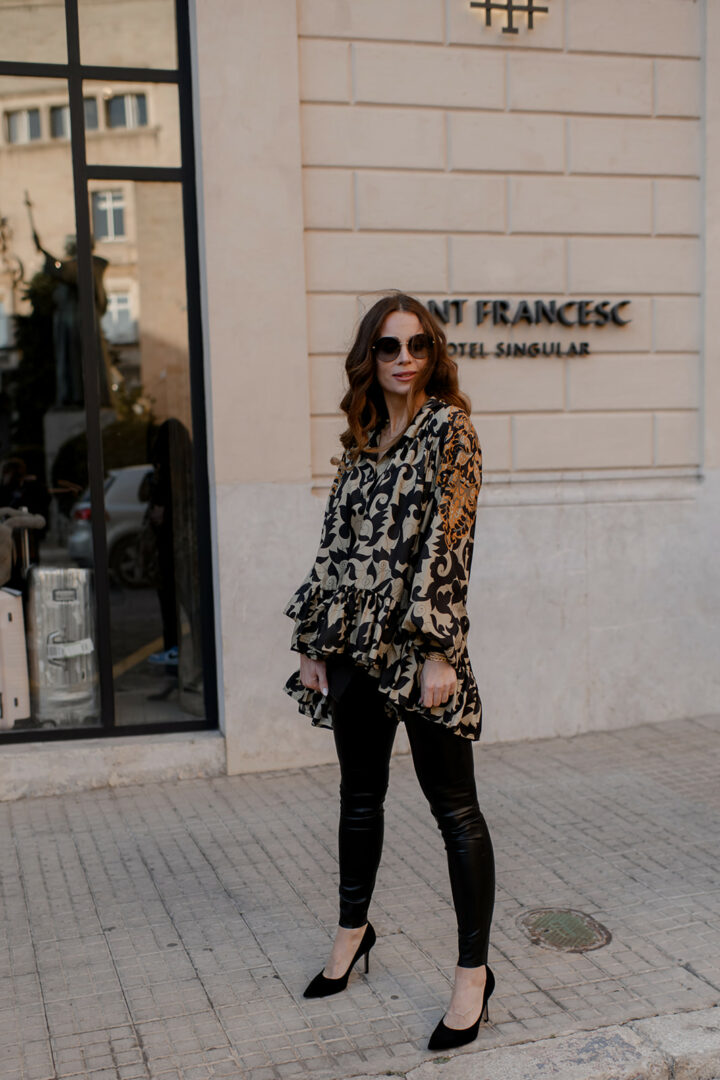 Entdecken Sie den Look, der Stil und Komfort vereint: die schwarze Lederleggings in Kombination mit einer lockeren Volantbluse. Diese vielseitige Kombination kann ohne oder mit Taillengürtel getragen werden, um Ihre Silhouette zu betonen. Klassische schwarze Pumps und eine kleine schwarze Clutch vervollständigen den Look und verleihen ihm eine elegante Note. Das perfekte Outfit für eine Nacht in der Stadt oder ein Abendessen mit Freunden. Probieren Sie diesen Look aus und erleben Sie die perfekte Kombination aus Stil und Komfort.