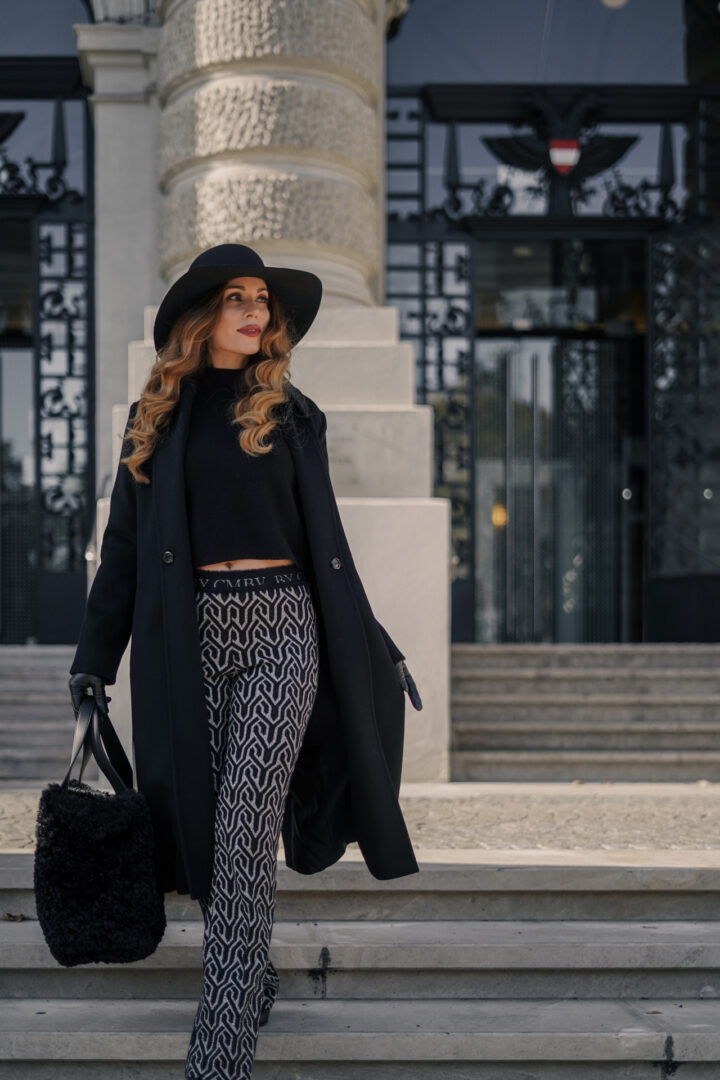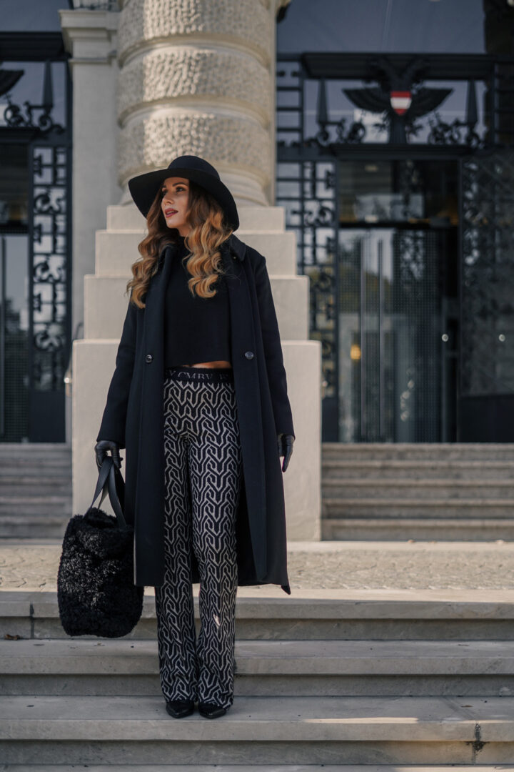 Wir sehen nicht Schwarz, wir tragen es! Elegante Kombi aus einer mustergültigen Flared-Hose, einem angenehmen Merino-Pulli und einem Mantel von Max Mara. Lady-like: Hut und Lederhandschuhe.