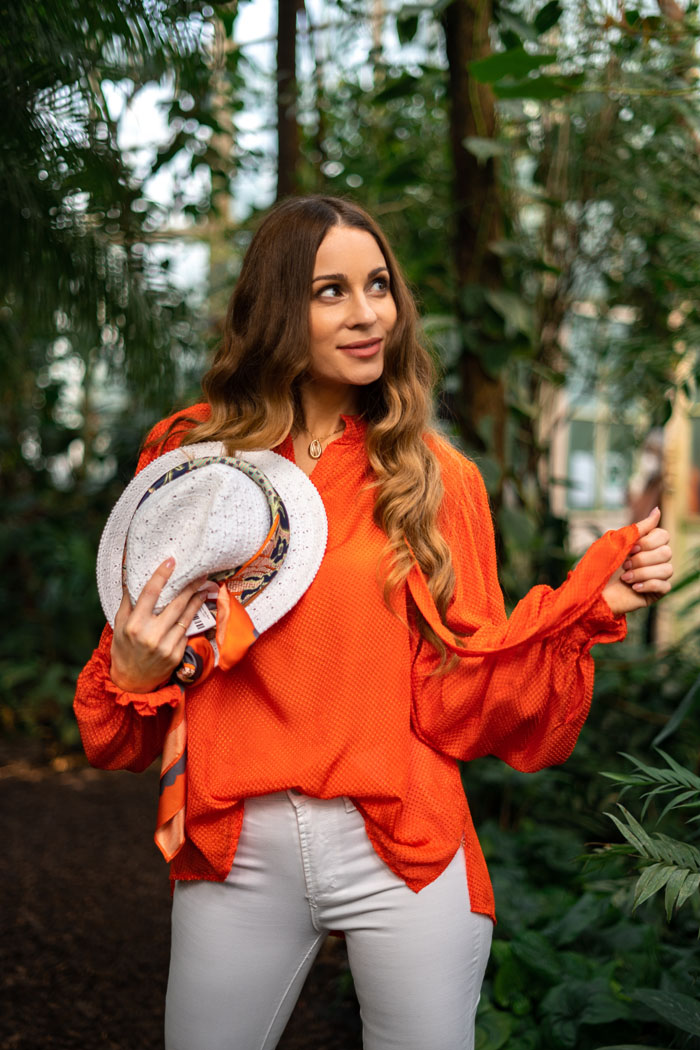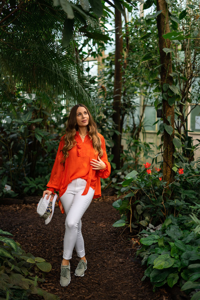 Eine Bluse mit Struktur, Puffärmeln, Rüschen an den Ärmeln und Schleifen – und als ob das nicht genug wäre, hat sie auch noch eine unübersehbare Farbe. Jackpot! Dezent dazu: eine weiße Slim-Fit-Jeans und superbequeme Sneaker von Kennel&Schmenger.