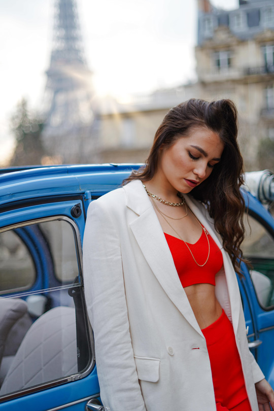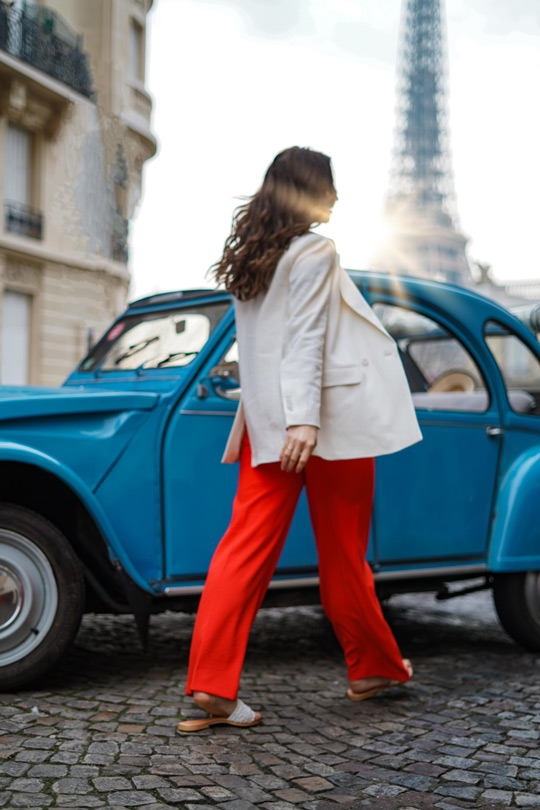 Eine farbliche Hommage an Frankreich: (orange)rot trifft auf (natur)weiß und blauen 2CV! Très chic ist die Kombination aus Hosen mit weitem Bein, Stricktops und Oversized-Blazern. Fast schon der Signature-Look der Saison …