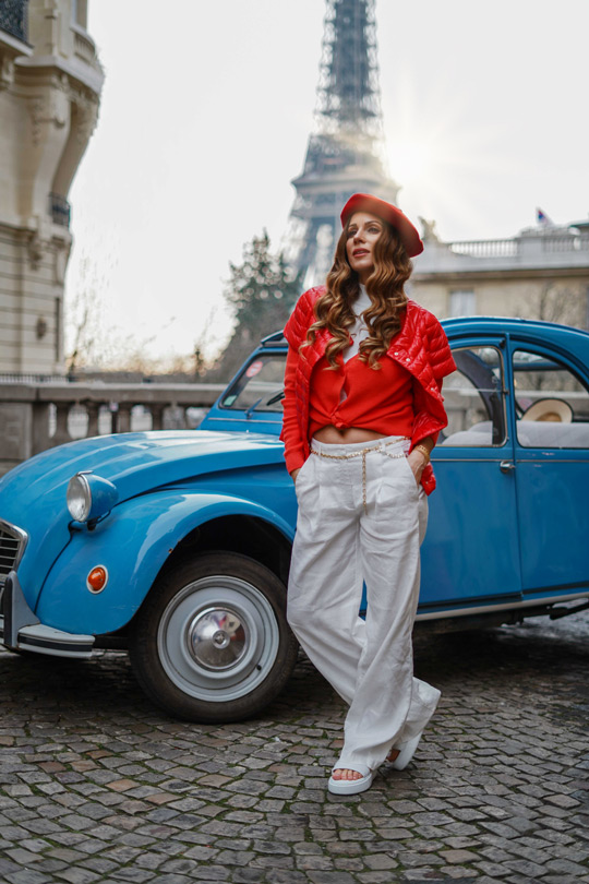 Eine farbliche Hommage an Frankreich: (orange)rot trifft auf (natur)weiß und blauen 2CV! Très chic ist die Kombination aus Hosen mit weitem Bein, Stricktops und Oversized-Blazern. Fast schon der Signature-Look der Saison …