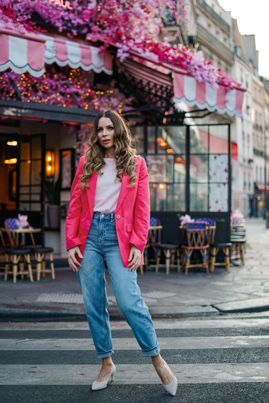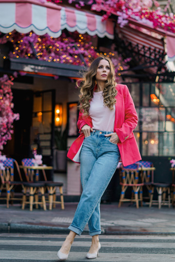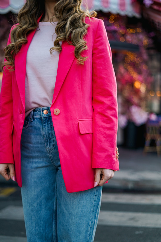 Die 90iger lassen grüßen: Die O-förmige Denim matcht sich perfekt zu T-Shirt und lässig fallendem Blazer.
