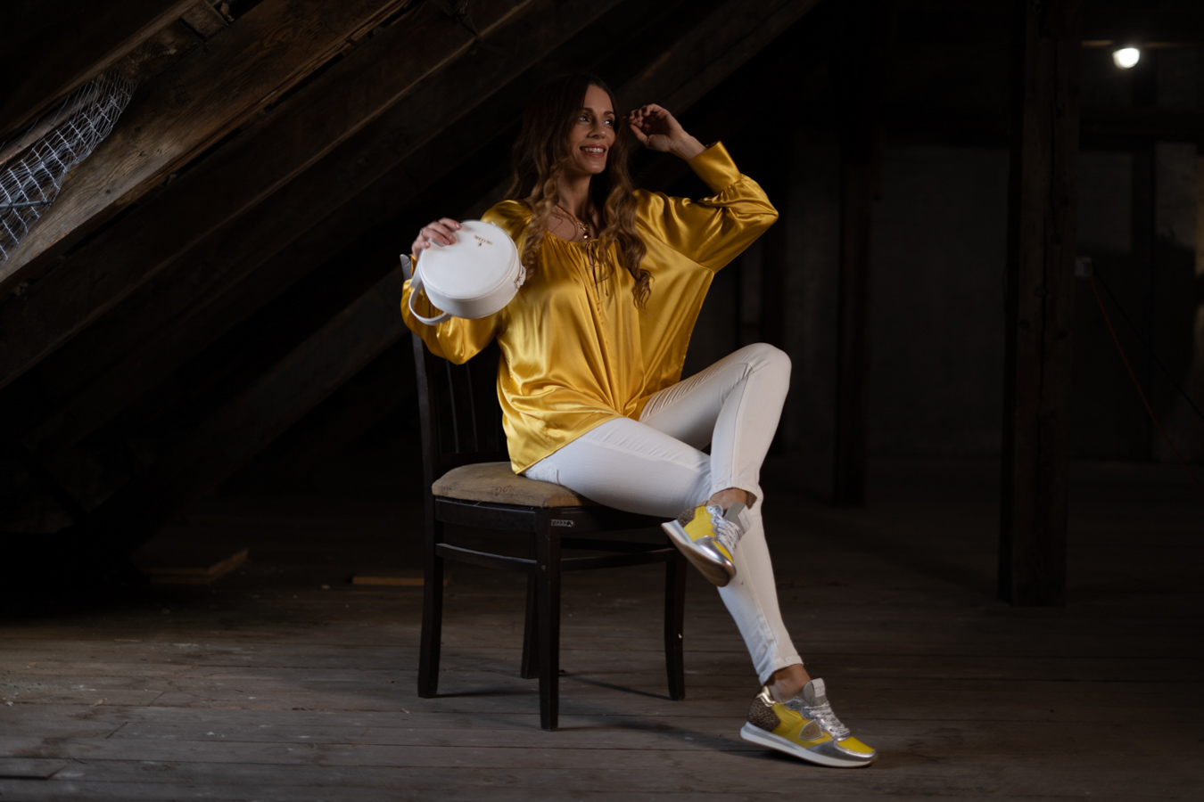 Diese Seidenbluse von Aglini sendet ein klares Statement: Here comes the sun! Mit den Sneakern von Philippe Model heißt es: I’m walking on sunshine. Bei der Hose heißt es: Black or White- Hier fiel die Wahl auf weiß. So, und eine kleine Spring-Playlist hätten wir nebenbei auch erstellt …