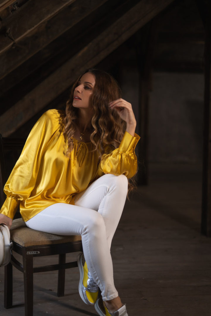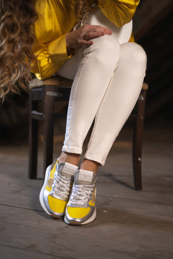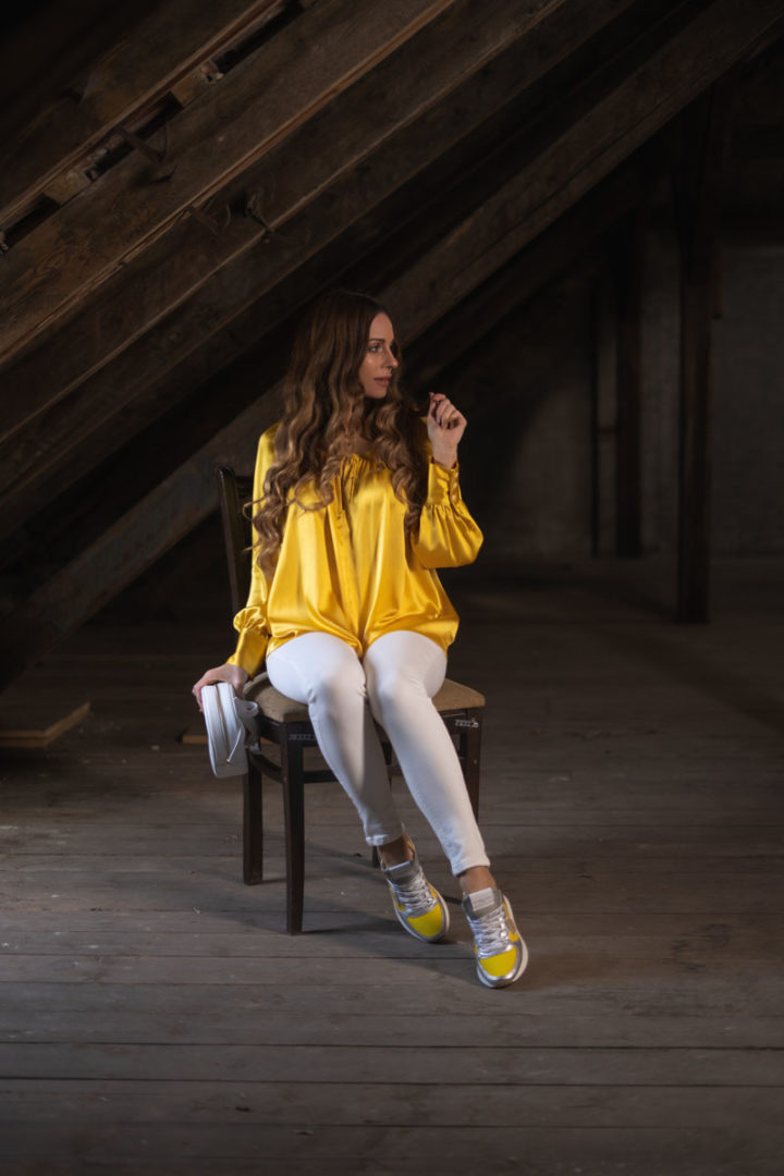 Diese Seidenbluse von Aglini sendet ein klares Statement: Here comes the sun! Mit den Sneakern von Philippe Model heißt es: I’m walking on sunshine. Bei der Hose heißt es: Black or White- Hier fiel die Wahl auf weiß. So, und eine kleine Spring-Playlist hätten wir nebenbei auch erstellt …