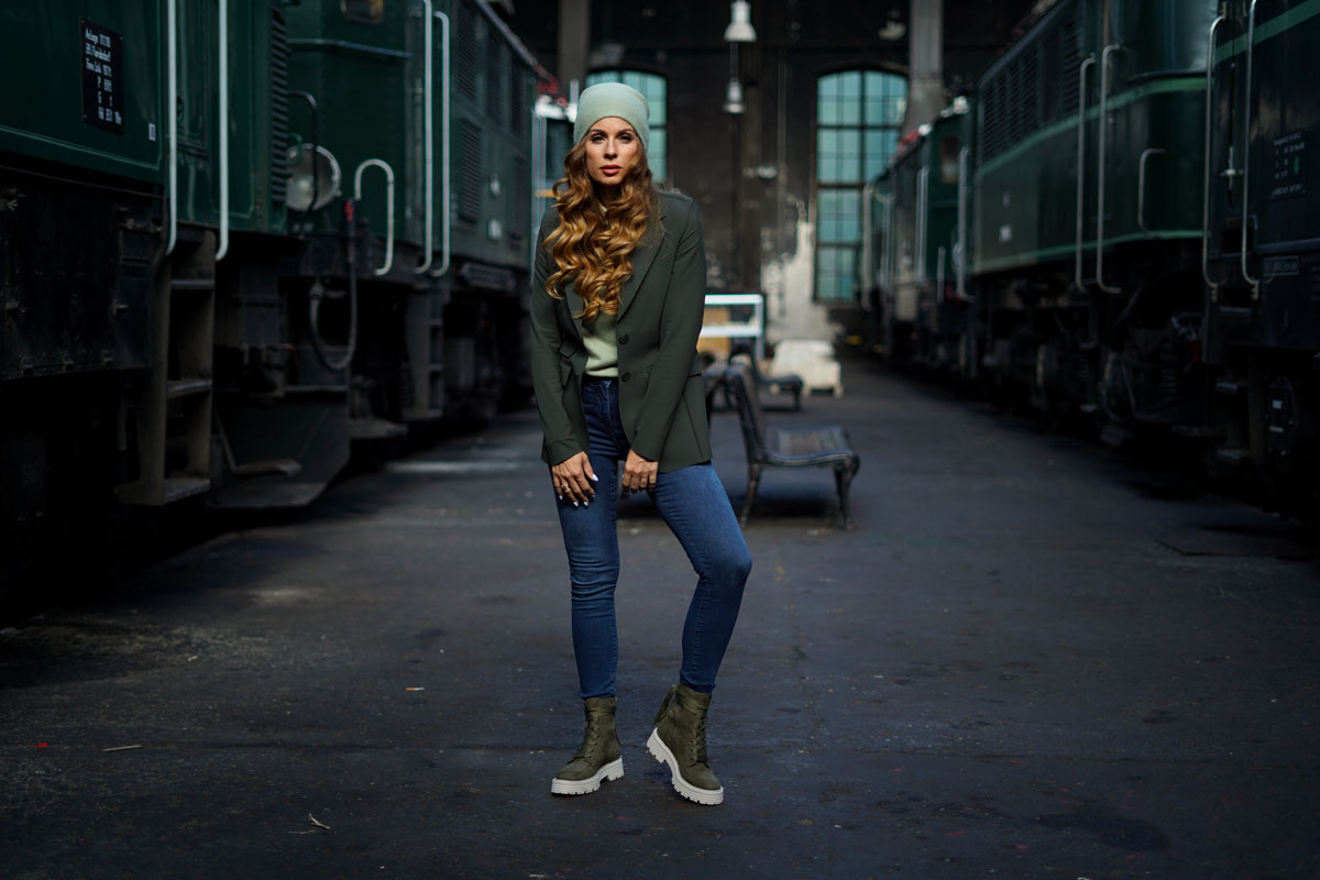 An der Kombi „Anzug und Boots“ führt styletechnisch einfach kein Weg vorbei. Hier treffen Darkgreen- auf Avocado-Töne: mixed, matched! Easy business: Der bügelfreie Blazer lässt sich bei 30 Grad in der Waschmaschine waschen.