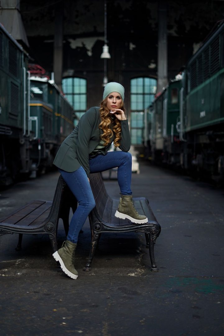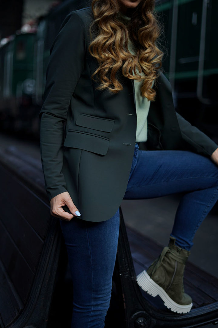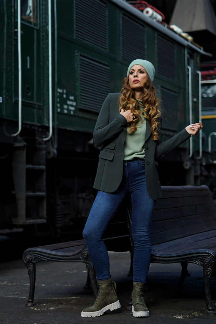 An der Kombi „Anzug und Boots“ führt styletechnisch einfach kein Weg vorbei. Hier treffen Darkgreen- auf Avocado-Töne: mixed, matched! Easy business: Der bügelfreie Blazer lässt sich bei 30 Grad in der Waschmaschine waschen.