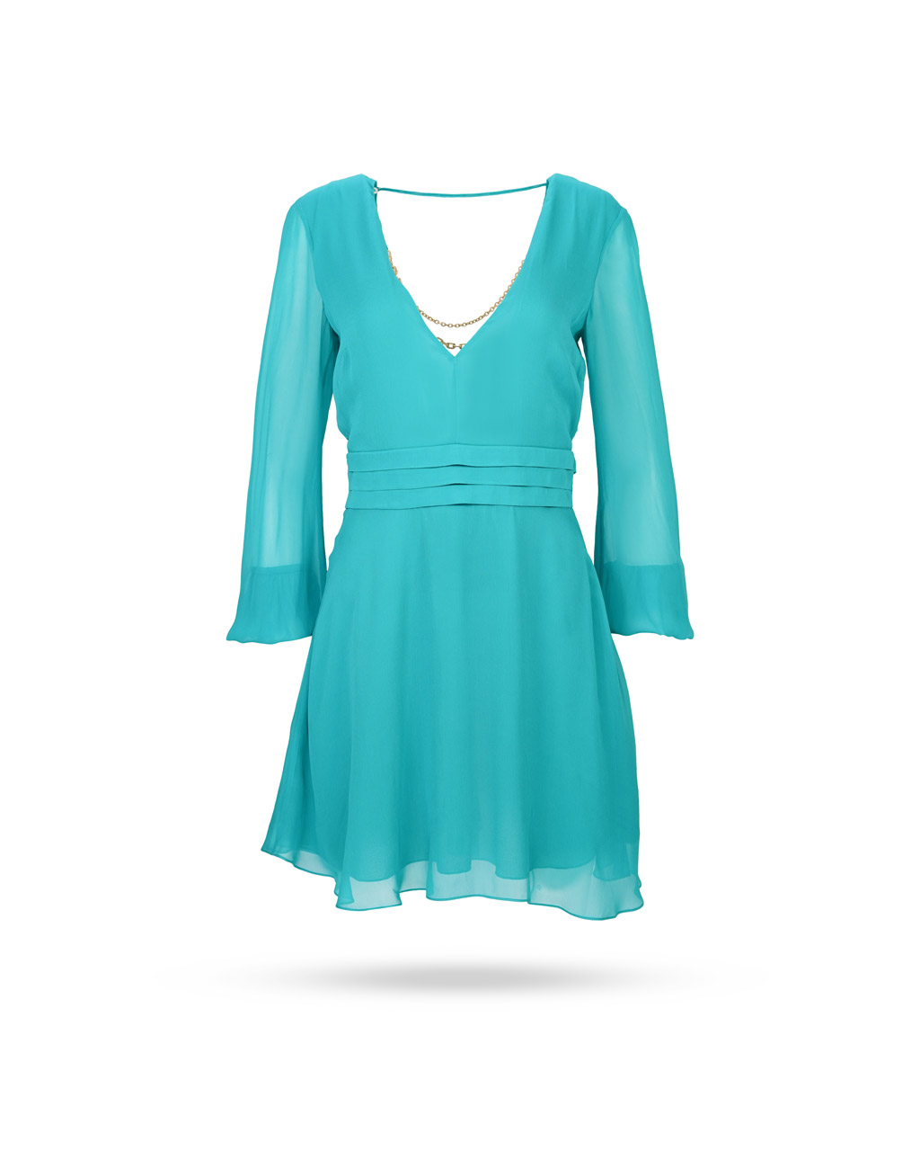 | Passform & Maße | tailliert, Bund mit Gürtel, tiefer V-Ausschnitt, tiefer Rückenausschnitt mit abnehmbarer Goldkette, Zipp zum Schließen |