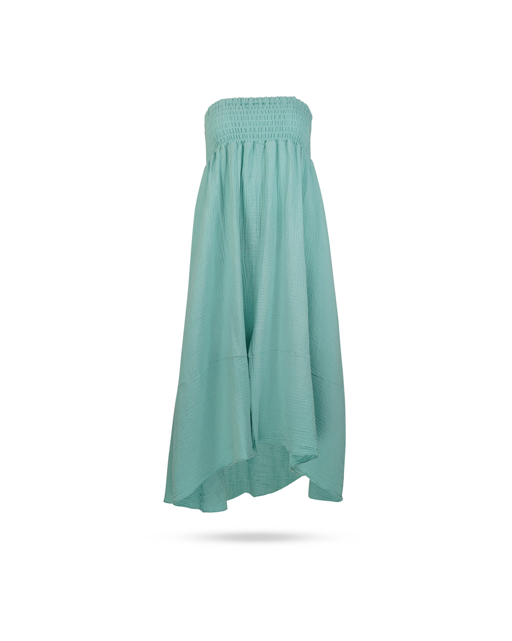| Passform & Maße | A-Linie, Länge reicht bis zur halben Wade, elastischer gesmokter Bund, kann auch als Bandeaukleid getragen werden |