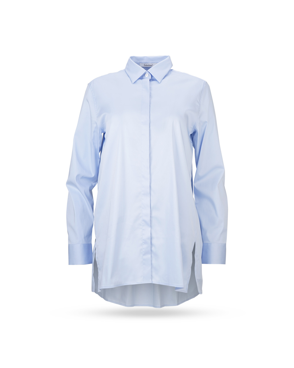 | Passform & Maße | regular-fit, versteckte Knopfleiste mit Kentkragen, seitliche Schlitze, Faltenlegung am Rücken, Länge reicht bis zum Po |