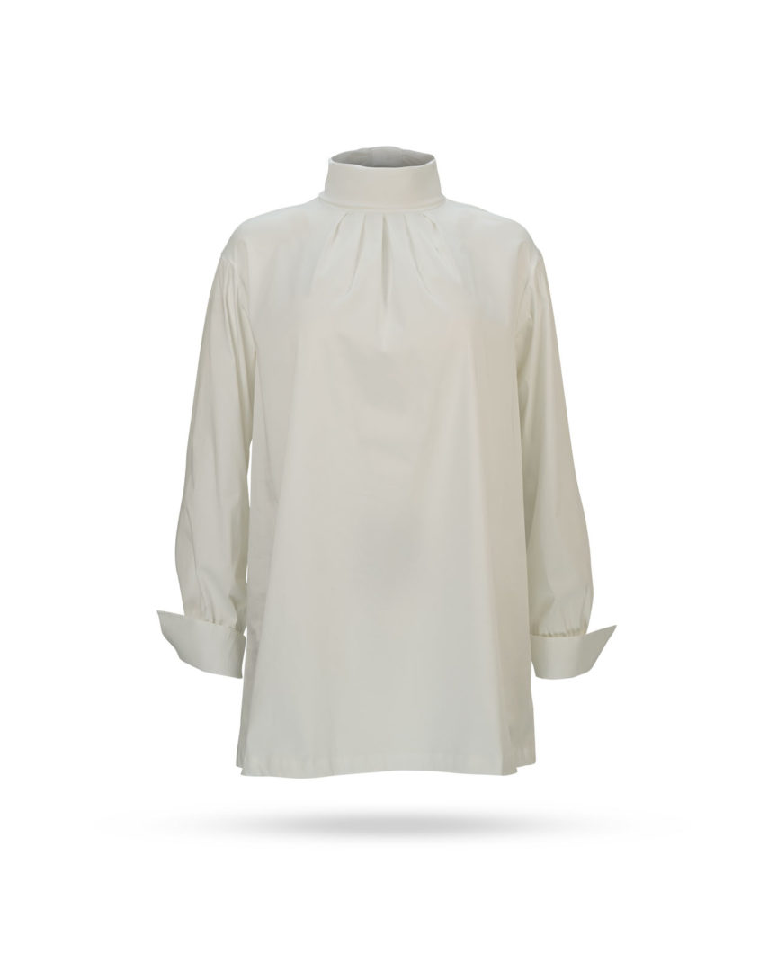 | Passform & Maße | A-Linie, Pliesses am Stehkragen, Rückseite durchgeknöpft |
